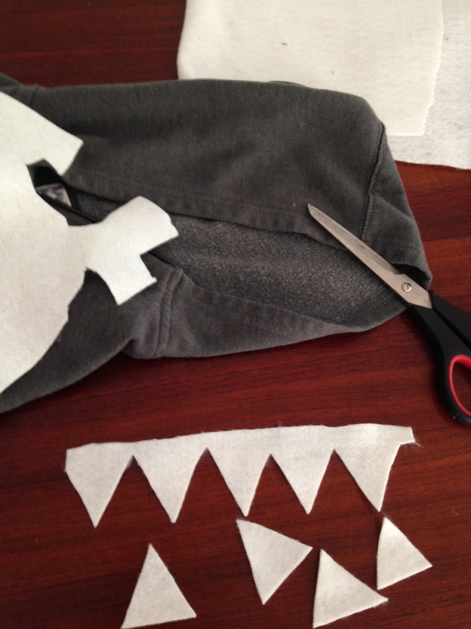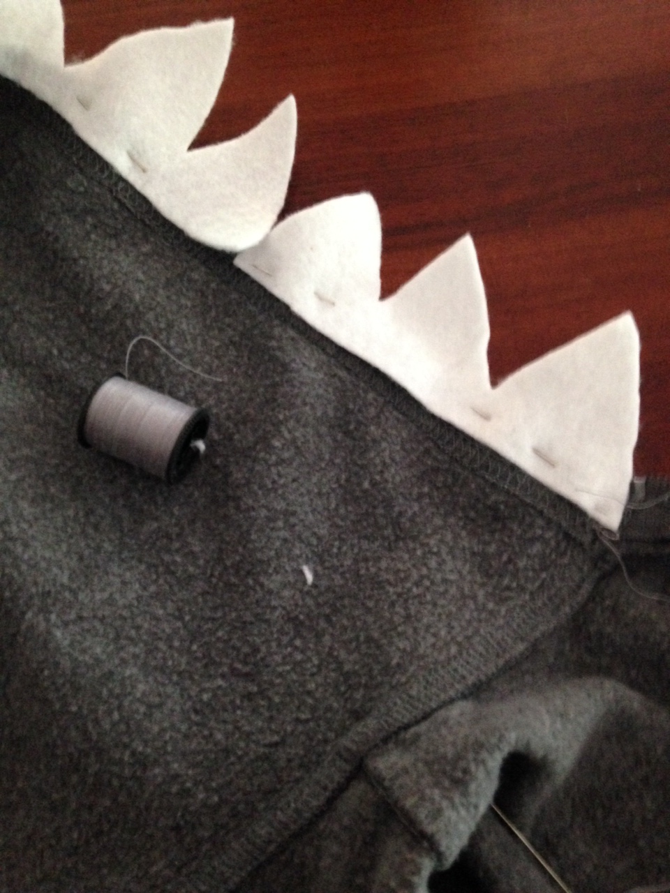 For the fin, I did the same sort of thing. Just traced out the fin shape onto the gray felt and sewed it onto the back of the sweatshirt.