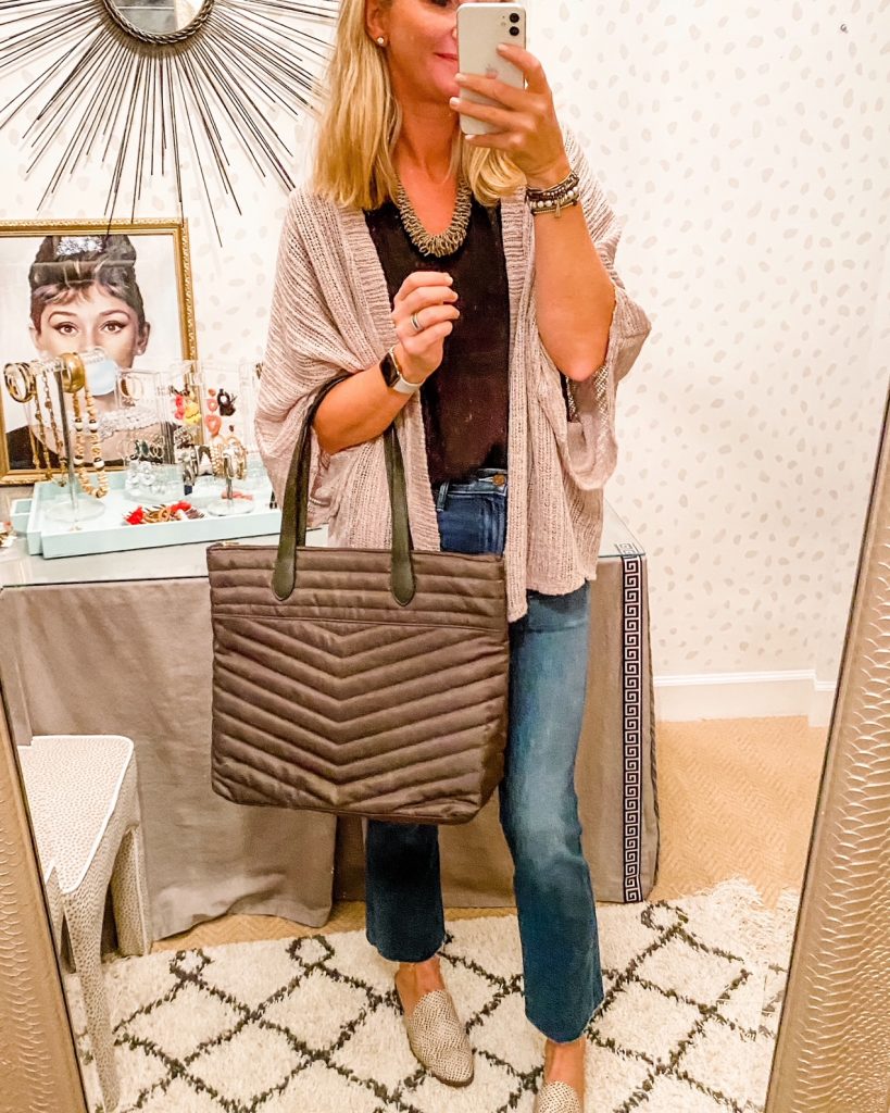 The Mother Hustler Ankle Frey Jeans || Black Blouse || Taupe Kimono || Taupe Beaded Necklace || Green Quilted Tote Bag
