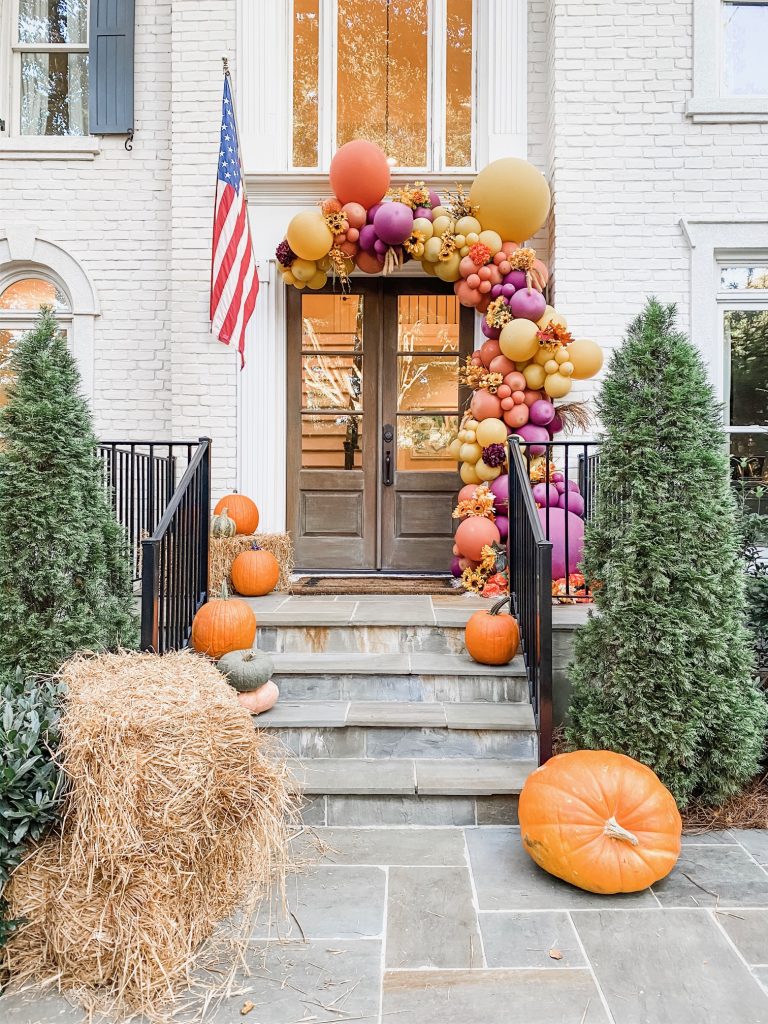 Our friends had a cute socially distant pumpkin patch party in their front yard last weekend. She hired a pumpkin farm to deliver a load of pumpkins and they were spread out all over her yard for people to come and grab and say hi. Isn’t that the cutest pandemic party idea? But the real show stopper was this beautiful balloon garland on her front door. It’s just the most “October” thing ever!