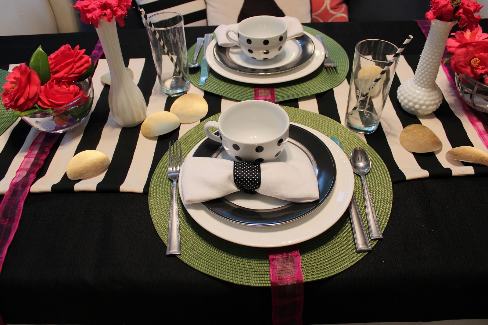 So very cute! I love Kate Spade-young and fresh! Love black, white and green together. The chalkboard quote is too cute (girls night out)! My husband reacted that way when he first started seeing me do tablescapes. 🙂