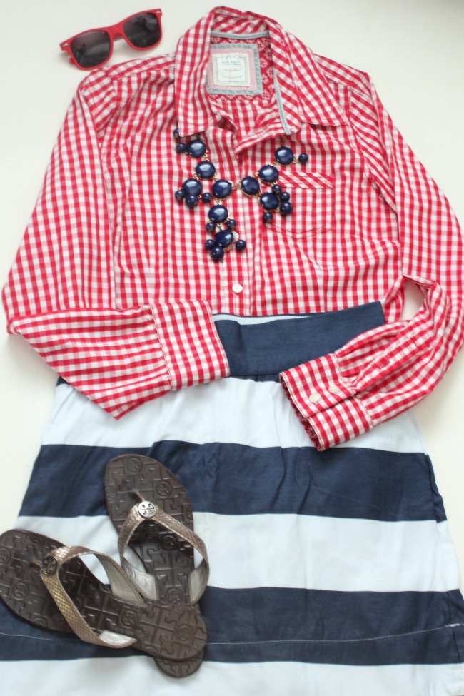 For a more dressed up look, I paired a navy striped skirt with red gingham. Put some prep in your American step.